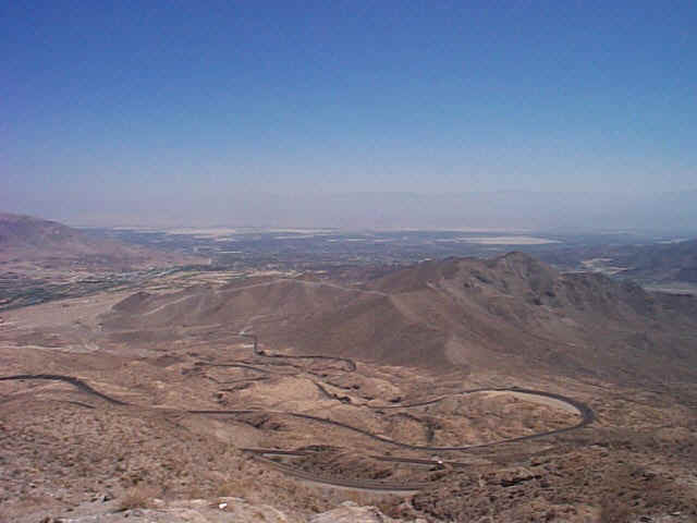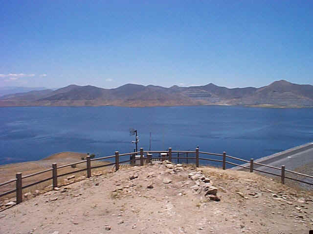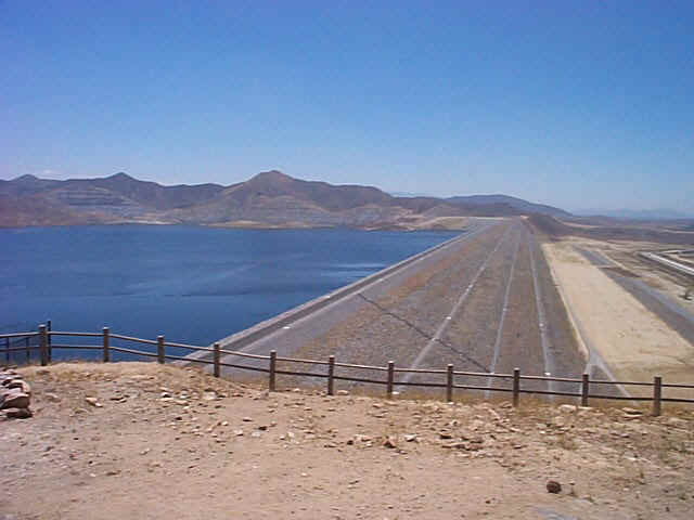 Got the RV washed at a truck wash, had breakfast at Denny's and left Palm Springs on Highway 74. The first picture is from a view point on Highway 74. Palm Springs is in the background and the highway is in the foreground. Continued on Highway 74 to Highway 79 and followed that through Hemet CA. Between Hemet and I-15 we came across a new lake. The next two pictures are Diamond Valley Lake, it is only about 25% full. Here is a link to a web site about Diamond Valley Lake. http://www.dvlake.com After leaving Diamond Valley Lake we continued on Highway 79 to I-15, then south on I-15 to Poway where we stopped to visit Marilyn's sister Joyce and and her brother in-law Eddie. Then it was south on I-15 to San Diego and home. It was a great trip for us and we hope you enjoyed it too. Send us some e-mail and let us know how you liked it. Final Dominos: Jim: 39, Marilyn: 43. Mileage today: 160 Total Mileage for the trip: 4413. Gas Mileage for the trip was 8.1 MPG. The End.