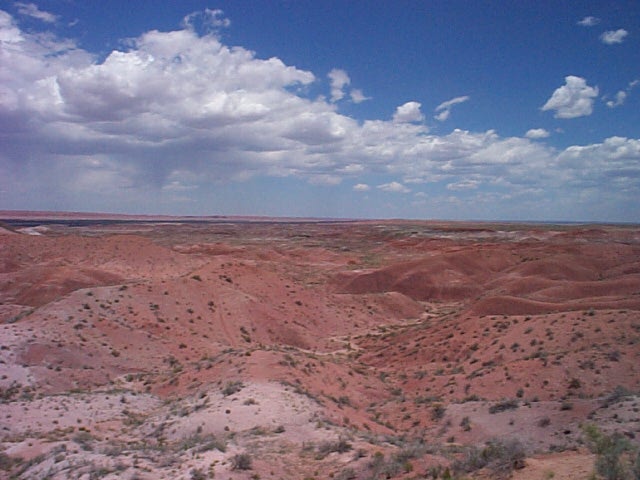 Click Pictures to Enlarge, Use Browser Back Button to Return Vacation 2001 Day: 12 Date: 05/30/2001 Left Meteor Crater and headed east on I40. Went back through Winslow and turned south on 180 at Holbrook. Drove on 180 to the entrance to the Petrified Forest National Monument. Toured the visitor center then continued north through the park stopping at various viewing spots. The north end of the park is in the Painted Desert. Had lunch at the Painted Desert Visitor center. Got back on I40 west back to Holbrook. Stopped outside town at a truck wash and got the RV washed. Got a spot to stay the night at the Holbrook KOA campground. Went shopping in town, came back to the campground and did laundry. We don't see many campgrounds north east of here where we are headed for so you may not hear from us for awhile. Pictures: Petrified Forest, Painted Desert and a Motel in Holbrook (The Tepees are the rooms).