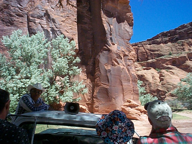 Click Pictures to Enlarge, Use Browser Back Button to Return Vacation 2001 Day: 13 Date: 05/31/2001 Left Holbrook going east on I40 to Chambers, turned north on 191 to Chinle Az. Found a place to camp at the Cottonwood National Park campground. It's free but no hook-ups. Walked over to the Thunderbird Lodge and got tickets for the afternoon half day tour of Canyon De Chelly. Our tour guide was a Navajo Indian named David who loaded us up in a four wheel drive flat-bed truck with seats bolted on the back. From the lodge we took off up the canyon, no roads only dirt tracks in the river bottom. David stopped along the way to show us petroglyphs, and ancient ruins in the canyon walls which are over 700 feet tall. After the tour we returned to the RV and grilled burgers, and listened to Indians sing and play drums somewhere near the campground until after 10PM.