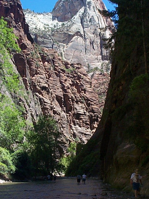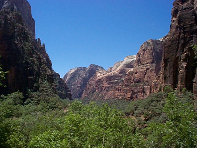 Click Pictures to Enlarge, Use Browser Back Button to Return Vacation 2001 Day: 16 Date: 06/03/2001 Left the RV park and had breakfast in Kanab (At the same restaurant we had dinner at last night). Drove north on 89 to 9 then west to Zion National Park. Toured the park on trams (The only way you can tour most of the park). Left Zion east on 9 back to 89. Had lunch/dinner at the intersection of 9 and 89, then continued north on 89 to 12, then east through Red Canyon to the Bryce Canyon Pines RV Park and Campground. Tomorrow we will tour Bryce Canyon National Park. Pictures: Zion National Park and Marilyn under Weeping Rock (In the park).