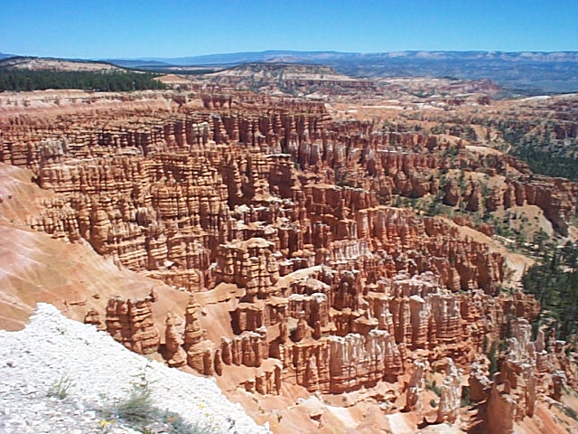 Click Pictures to Enlarge, Use Browser Back Button to Return Vacation 2001 Day: 17 Date: 06/04/2001 Broke camp and went to the tram stop outside Bryce Canyon National Park. Caught the Blue line into the park and got off at the Visitor center. Found out that the 10:00AM and 1:00PM Green tram trips were booked up. We put our names on the waiting list for the 1:00PM trip. Then I suggested we go back and get the RV and try to do the tour ourselves. So we did and it worked out fine. We were able to park at all the stops with no problems. We were finished with the tour and leaving the park at about 1:00PM. Continued east on highway 12 (over a 9400' pass) to highway 24, then to Hanksville, where we are staying the night (No modem). Pictures: Bryce Canyon National Park.