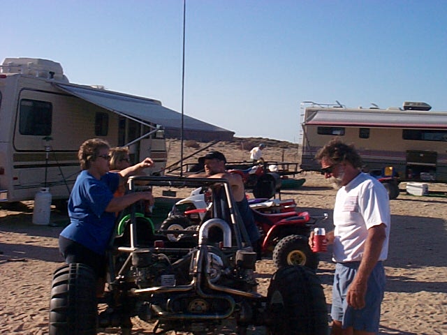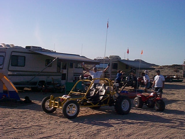 Click Pictures to Enlarge, Use Browser Back Button to Return Day 1 Date: 05/04/2002 Left San Diego 6:30AM east on Interstate 8. Stopped for breakfast in Alpine. Crossed the boarder into Mexico at Calexico/Mexicali. Drove south from Mexicali on highway 5 to San Felipe B.C. Mexico. Took Marilyn on a tour of the town (about 10 min.) then headed south to our campground "Las Conchas". Where we met up with a group of people that Jim used to go to Mexico with every year for a reunion. Our reservations got messed up so we had to set up in a temporary location for the night, no big deal. The pictures are of our temporary camp site. Domino Scores Jim: 2 Marilyn: 1 Lowest Gas Price: $1.54 Heber CA Mileage Today: 270 Mileage For Trip:270