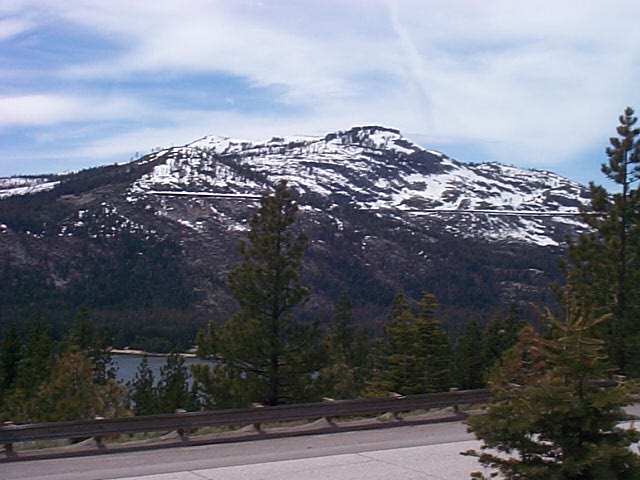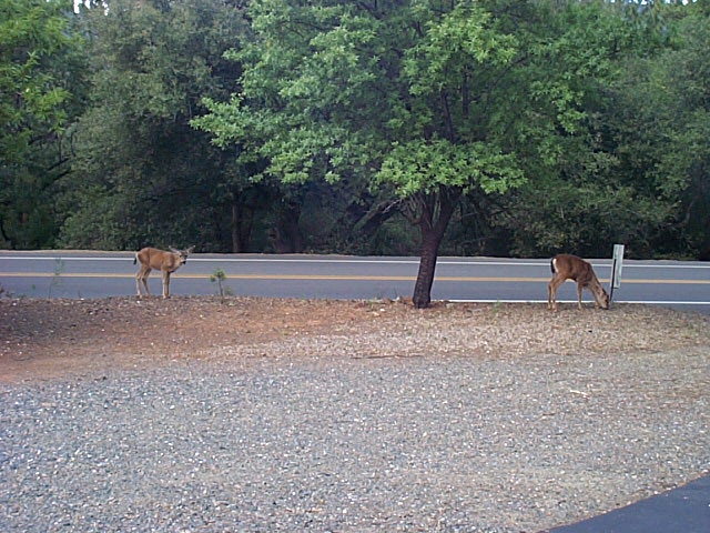 Click Pictures to Enlarge, Use Browser Back Button to Return Vacation 2002 Day: 24 Date: 05/27/2002 After eating Bacon and French Toast in the RV we continued east on I-80. Had the California Vegetable Police come in the RV at the California boarder and confiscate our cherries (The Mexican Federal Police searched the RV twice and they didn't take anything). Stopped to take pictures of the snow on Donner Pass above Donner Lake near Truckee California. Ended up at Jim's Father's house in Auburn CA. to spend the next few days. Jim's father, Bob Nordberg, celebrated his 90th. birthday yesterday. The picture of the deer was taken in the front yard. I didn't say anything about the weather yesterday, we finally got some warm weather in Utah and Nevada (mid 70's). The temperature in Auburn was 75 when we arrived. The forecast for mid-week is mid to high 90's.