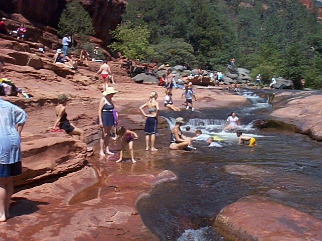 Click Pictures to Enlarge, Use Browser Back Button to Return Vacation 2003, Day 3 Date: 09/07/2003 The Cicadas were quiet during the night, but started making noise about 8:30AM. Finally got to see one and take it's picture. Had breakfast in the RV, waffles and bacon. Packed up the RV and headed north on highway 89A. Stopped at Slide Rock State Park and took some more pictures. Continued on 89A to Flagstaff, then 160 to Tusayan where I pulled into the Grand Canyon Airport to see about a helicopter tour. Marilyn decided she might not be ready for that, so we went to the IMAX theater and saw a movie on the Grand Canyon. After the movie we entered the park and went to the Travel Village campground to check in. Surprise, Stacie, Jim's daughter was working in the office. After Stacie got off work we went to dinner at the Bright Angel restaurant. After dinner we went back to the RV and visited. Domino Scores Jim: 3 Marilyn: 5 Lowest Gas Price: $1.69 Flagstaff Mileage Today: 111 Mileage For Trip: 573