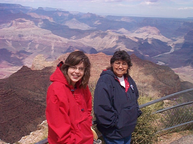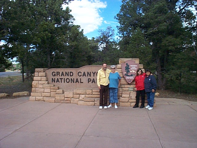 Click Pictures to Enlarge, Use Browser Back Button to Return Vacation 2003, Day 4 Date: 09/08/2003 Had breakfast with Stacie and her friend Angel at Bright Angel Lodge. Then went on the Desert View Tour of the east rim of the Grand Canyon. After the Desert View Tour we did lunch at a pizza place in Tusayan just outside the park. After lunch we came back to the RV for a short rest then we all went on the Sunset Tour of the east rim. Then back to Tusayan for dinner at Grand Hotel. The pictures are Jim and Stacie, Stacie and Angel, Jim Marilyn Stacie and Angel, Our Sunset Tour Guide Clyde, The Sunset. Domino Scores Jim: 3 Marilyn: 5 Lowest Gas Price: $ Mileage Today: 0 Mileage For Trip: 573