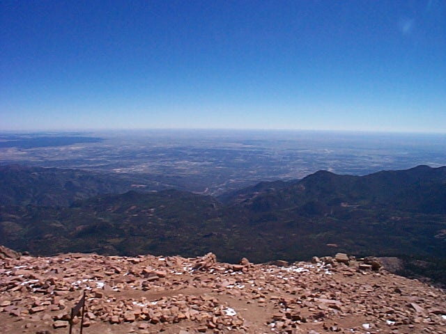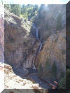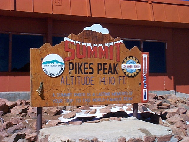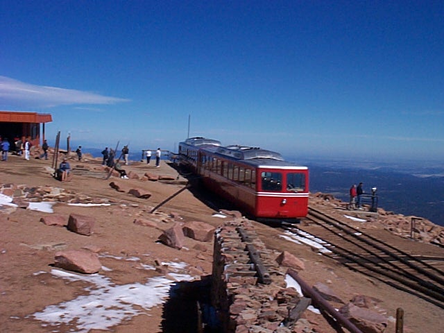 Click Pictures to Enlarge, Use Browser Back Button to Return Vacation 2003, Day 8 Date: 09/12/2003 Cereal for breakfast. Called Pikes Peak Cog Railroad and got reservations for the 9:30AM train to the top of Pikes Peak. Made the trip up the mountain and bought some souvenirs at the top. The guide said they were having a heat wave (40 deg. at the top) and that the air was the clearest it has been all year. Road back down the mountain and had some lunch in the RV. From there we went to Seven Falls. From Seven Falls we got on hwy 25 north towards Denver. Stopped for the night at the Castle Rock Campground near Castle Rock. No stream this time, just a railroad track, with lots of trains! Went into the town of Castle Rock and had dinner at Duke's Steak House. Marilyn had a piece of Walleye that hung off both sides of the plate and I had Steak and Shrimp. We gave it 3 1/2 stars out of four. Domino Scores Jim: 10 Marilyn: 12 Lowest Gas Price: $1.58 North of Colorado Springs. Mileage Today: 82 Mileage For Trip: 1387