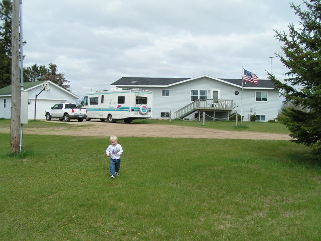 Click Pictures to Enlarge, Use Browser Back Button to Return Vacation 2004, Day 7 Date: 05/12/2004 Marilyn went to lunch with her sister Judith, her sister-in-law Kathy Angus and two cousins, Pat and Jackie Angus. Mischa, Devin and I went shopping then we met up with Marilyn after her lunch. Kathy's car broke down so we drove her home to Wadena. Kathy and her son Mike took us to dinner at Pizza Ranch in Wadena then we went back to Kathy's house, played cards and camped out in her driveway. Picture: Devin in front of Kathy and Mike Angus's house. Shanghai Scores Jim: 2 Marilyn: 2 Mischa: 6 Lowest Gas Price: $1.92 Mileage Today: 190 Mileage For Trip: 2491