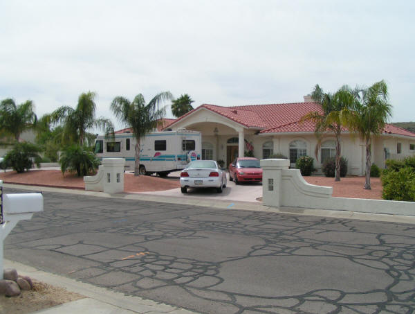 Click Pictures to Enlarge, Use Browser Back Button to Return Day 1 Date: 05/13/2005 Well here we go on the road again. We weren't supposed to leave until Saturday morning but Marilyn got Friday off from work so after dropping Devin at pre-school, going out to breakfast and finishing packing we took off headed east on I-8. Our first stop was in Phoenix to visit Jon and Faye Velle. Jon and Faye fed us dinner then we helped Faye put signs around the neighborhood for a garage sale she is having in the morning. Visited with Jon and Faye until about 10:00PM and went to bed. Domino Scores Jim: 0 Marilyn: 0