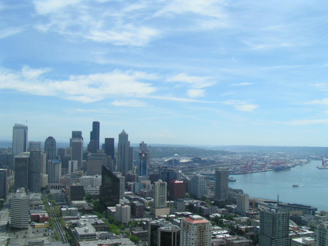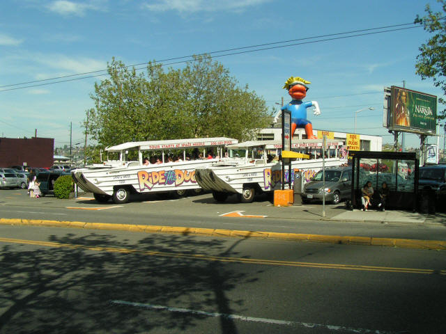 Click to enlarge picture, use back button to return Vacation 2008 Day 10, May 17 Sausage and eggs in the RV then drove the rental car into Seattle. Went to The Space Needle, got in line to get tickets, then got in line to go to the top. A sign said 50 min. wait but it was longer than that! When we got to the top the view was great! After coming down from the "O-Deck" we went across the street and got tickets for a Duck Ride. We had an hour and a half wait so we went back across the street to "EMP" (Experience Music Project, "The worlds only Hands-on Music Museum") and the "SFM" (Science Fiction Museum and Hall of Fame). After the museums it was back to the Duck tour. "Chuck the Duck Captain" took us on a tour all around downtown Seattle and then for a cruse on Union Lake. After the Duck tour it was time to head back to the campground. We ate supper at Outback Steak House near the campground.