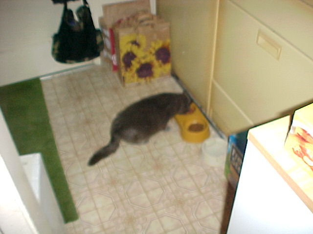 Click to enlarge picture, use back button to return Vacation 2008 Day 20, May 27 Took dad to drop off one of his hearing aids for repair. Then we went over to animal shelter to look for a new companion for dad. He had a cat named Misty for the last 14 years, but Misty had to be put to sleep recently. We found a grey female about three years old. She came right to the front of her cage and wanted to make friends. It took about 30 seconds for dad to say that's the one. We brought her home and she is now "Misty II". Marilyn cooked spaghetti for supper, then we played Yahtzee (Jim 1, Marilyn 1).
