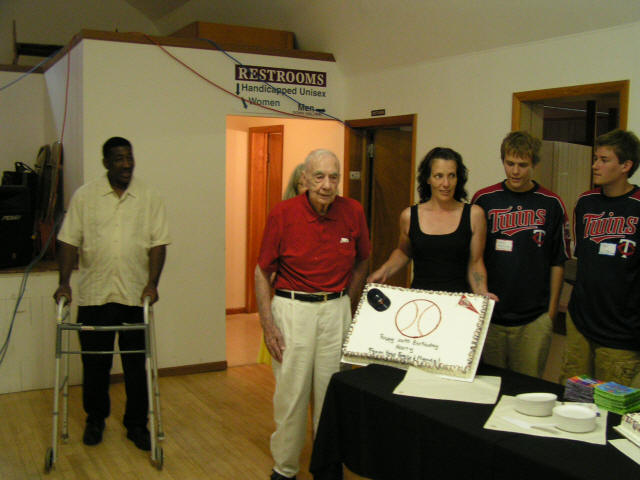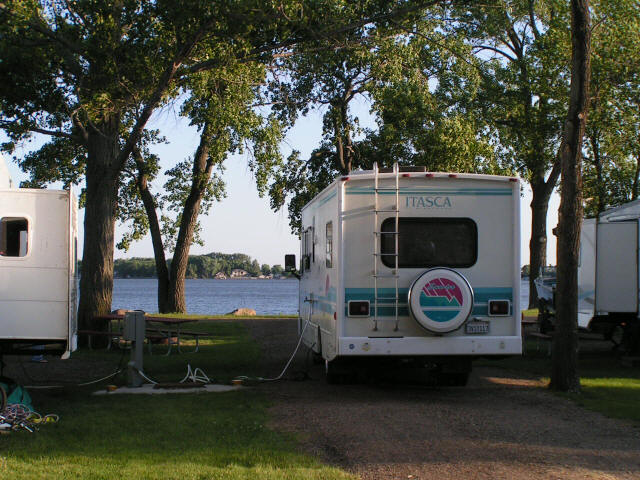 Click to enlarge picture, use back button to return Vacation 2009, Day 17, June 27 Susie had wanted to fix us a big breakfast but we had told her no since we are going to a party, so we had a light breakfast in the RV. After breakfast we drove over to Lake Miltona and visited Charles and Pat Angus, Charles is Marilyn's uncle. Next we drove over to Millerville for the party. The occasion was to celebrate the 100th birthday of Marilyn's uncle, Harry Rores. The party was still going strong when we decided to leave and start driving west and south. After leaving Minnesota we were driving south in South Dakota when we hit rain and high winds. We continued south until we got to Watertown SD where we got a camping spot right on Lake Kampeska at Memorial Park Campground. By the time we got to the campground the rain had stopped, the sun was out and the wind had let up. Domino Scores Jim: 16 Marilyn: 13 Weather: morning rain, afternoon partly cloudy, then rain and wind, then partly cloudy Lowest Gas Price: $ Mileage Today: 201 Mileage For Trip: 3524