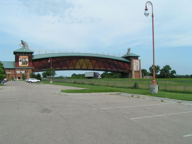 Click to enlarge picture, use back button to return Vacation 2009, Day 18, June 28 Had breakfast at Perkins Restaurant in Watertown SD. From Watertown we drove south on I-29 into Iowa, then got on I-680 west to avoid Counsel Bluffs IW and most of Omaha NB and got on I-80 west. At Kearney NE we got off the interstate and got gas for the RV. We went to The Great Platte River Road Archway which is an arch across I-80. The arch is located halfway between San Francisco and New York on what was the Lincoln Highway, the first highway that went from coast to coast. Inside the arch are displays of pioneers going west, the pony express, the first transcontinental telegraph and much much more. After the arch it was supper at Perkins Restaurant in Kearney and back on I-80 west to Gothenburg NE where we are staying at the KOA. Domino Scores Jim: 16 Marilyn: 15 Weather: mostly clear, high 80's Lowest Gas Price: $2.42 Mileage Today: 538 Mileage For Trip: 4062