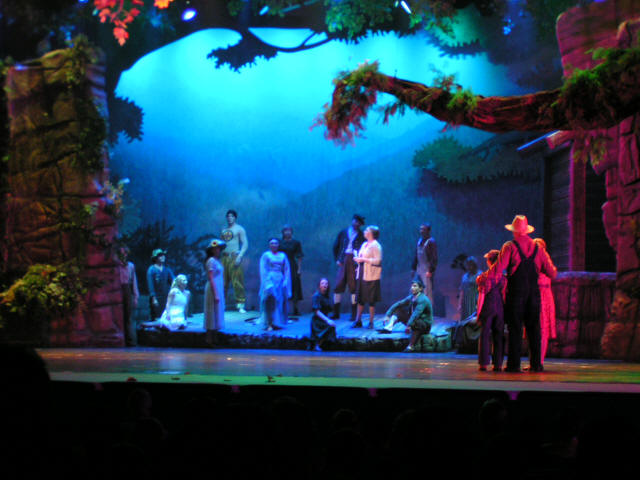 Vacation 2011, Day 16, June 18 Dolly's Old Tour Bus - Sha-Kon-Hey! show - Lee Greenwood Had breakfast at the Pancake House. Because we went to Dollywood after 3pm yesterday our tickets are good for today also, so back on the Fun Time Trolley for the ride back to Dollywood. First we went to see The Bazillion Bubble Show with Fan Yang. Then we walked around until time for next show, Sha-Kon-Hay! Land of Blue Smoke. When we got out of the show it was pouring rain with lightning and thunder. After waiting for awhile we made a dash for a shop where we bought some ponchos and headed for the trolley stop, we had seen about everything we wanted to anyway. This morning I saw in a schedule of what's happening in Pigeon Forge that said Lee Greenwood was playing at the Smith Family Theater tonight. While waiting for the Sha-Kon-Hay! show to begin I called the theater and got two seats to the dinner show. So at 6:00pm we caught the trolley and went to the theater, Had supper and watched the show. Both of us like Lee Greenwood and his show was good. After the show it was back on the trolley to camp. We got home at 10:30pm.