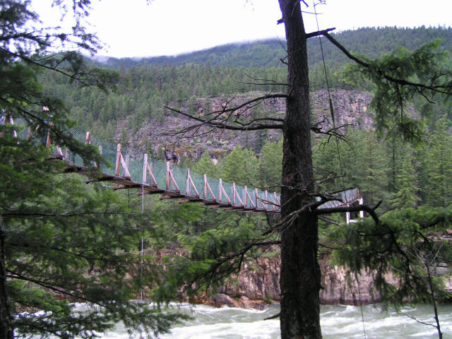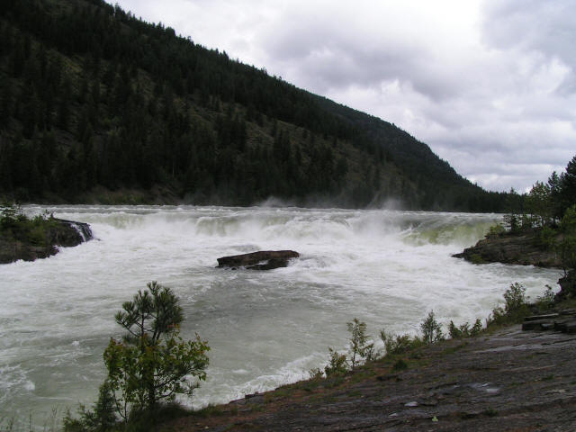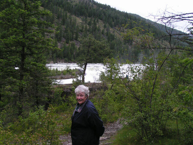 Vacation 2012, Day 11 June 26 1. Swinging Bridge at Kootenia Falls 2. Kootenia Falls 3. Marilyn at Kootenia Falls Click pictures to enlarge. Woke up to rain. Fixed French Toast and sausage for breakfast in the RV. Packed up and left Coeur D'Alene on US 95 north. At Sandpoint ID we joined up with US 2 east. Continued on US 2 into Montana "Big Sky Country". Saw a sign for Kootenia Falls so we stopped and Hiked back through the forest on wet muddy trails to a swinging bridge and then the falls. At least the rain stopped the whole time we were stopped but started again when we got back in the RV. After the falls it was back on US 2 to Kalispell MT where we stopped for supper at Finnegan's Family Restaurant. Continued east on US 2 to West Glacier KOA to spend the night. Domino Scores Jim: 30 Marilyn: 22 Weather: Rainy and cool most of the day. Lowest Gas Price: $3.479 Mileage Today: 247 Mileage For Trip: 2909 Copyright 2012
