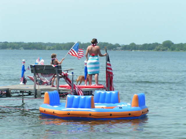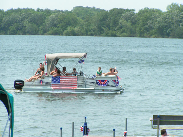 Vacation 2012, Day 19 July 04 1. The dock decorated for the 4th. 2. One of the boats in the parade. Click pictures to enlarge. Packed up the RV and drove into Clearwater and at Breakfast at Keith's Kettle Restaurant. From Clearwater we drove to Lake Francis where Marilyn's Brother Fred and his wife Linda are having their annual Fourth of July Party. Enjoyed the day with lots of nice people. The dock was decorated for the 4th and there was a boat parade . Later Fred took us on a pontoon boat ride around the lake. There was a pot-luck for supper, the main course was prime rib that Fred cooked on the Weber. Domino Scores Jim: 45 Marilyn: 42 Weather: Record heat with high humidity. Lowest Gas Price: ? Mileage Today: 41 Mileage For Trip: 4211 Copyright 2012