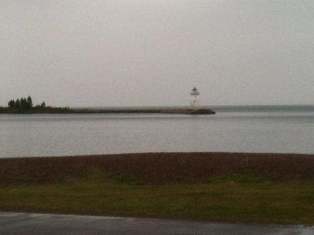 Vacation 2012, Day 21 July 06 Grand Marais harbor and light house. Click pictures to enlarge. Had breakfast in the RV. Got back on I 35 north. Ran into roadwork and had to take a detour on Hwy 23 until we got to Duluth MN. At Duluth we got on North Shore Drive. While we were on North Shore Drive it started to rain hard, so we decided to drive to Grand Marais and stay the night and sight see on the way back when the weather in better. Got a place to stay at Grand Marais Recreation Area. The rain had let up so we walked (about a mile) to a restaurant called Harbor Lights. It wasn't a real good choice, the service was slow, they brought Marilyn the wrong meal and had to replace it and the food wasn't all that great. After supper we walked back to the RV for dominos and ice cream. Domino Scores Jim: 52 Marilyn: 51 Weather: Mild and some rain, some heavy. Lowest Gas Price: Mileage Today: 185 Mileage For Trip: 4507 Copyright 2012