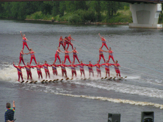 Vacation 2012, Day 27 July 12 1. Old Log Theater. 2. Twin Cities River Rats. Click pictures to enlarge. Judith had to work in the morning. We borrowed Phil's car and did some shopping at Target. Phil and Judith took us to see a play at the Old Log Theater in Excelsior MN. After the play it was back to their house for supper. Then Judith took us to see the Twin Cities River Rats water ski show team put on a performance in Minneapolis on the Mississippi River. Then back home and played Shanghai (Judith won). Domino Scores Jim: 59 Marilyn: 60 Weather: Warm, cloudy. Lowest Gas Price: $3.349 Mileage Today: 0 Mileage For Trip: 5209 Copyright 2012