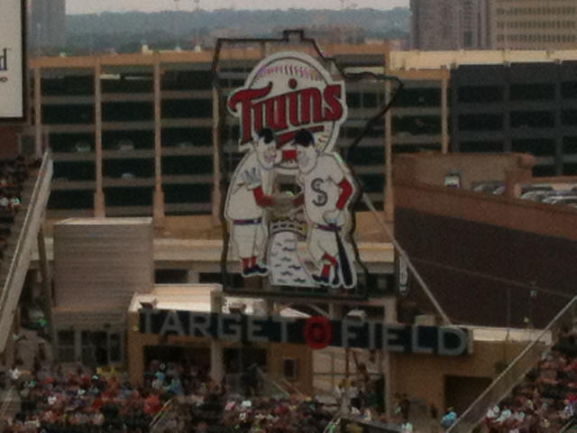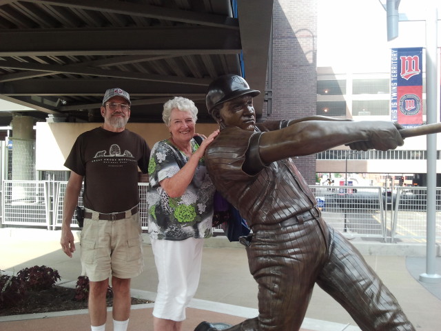 Vacation 2012, Day 30 July 15 1. Sign at Target Field. 2. Diamond at Target Field. 3. Marilyn and Me with Harmon Killabrew. Click pictures to enlarge. Went to breakfast with Phil and Judith at Harbor Side Restaurant. Phil and Judith then took us to Target Field to see the Twins play Oakland, unfortunately the Twins lost. After the game it was back to Phil and Judith's where we were joined by their son Robert, his wife April and their son Caleb for supper. After Rob, April and Caleb had gone home we played a game of shanghai (I won). Domino Scores Jim: 62 Marilyn: 63 Weather: Sunny, hot and humid. Lowest Gas Price: ? Mileage Today: 0 Mileage For Trip: 5581 Copyright 2012