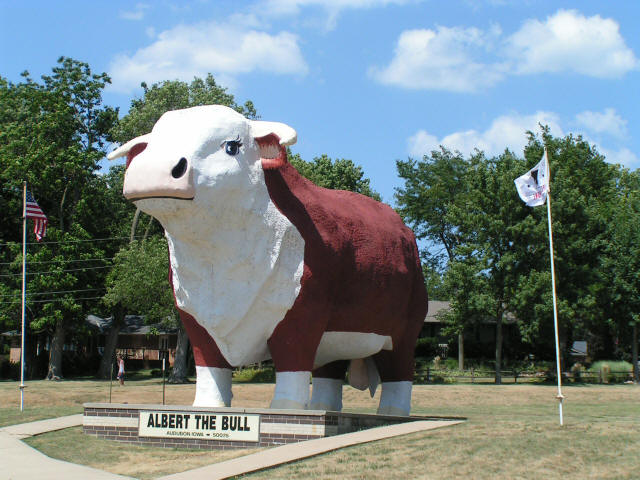 Vacation 2012, Day 39 July 24 Albert the Bull Click pictures to enlarge. Packed up the RV, drove back into Pipestone and ate breakfast at Lange's Cafe. Drove south on US 75 to Sioux City IA then east on US 20 to US 71 south to Audubon IA where we saw Albert the Bull, the worlds largest Bull. After seeing Albert we continued south on US 71 to I 80 west until we reached Council Bluffs IA where we got a place to stay at the Horseshoe Casino RV park. Ate supper at J. B. Steakhouse in the casino. Domino Scores Jim: 75 Marilyn: 79 Weather: Sunny, Hot Humid and windy. Lowest Gas Price: $3.399 Mileage Today: 318 Mileage For Trip: 6744 Copyright 2012