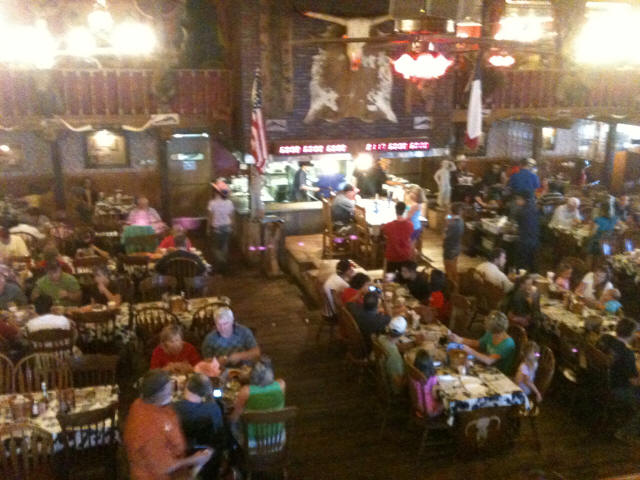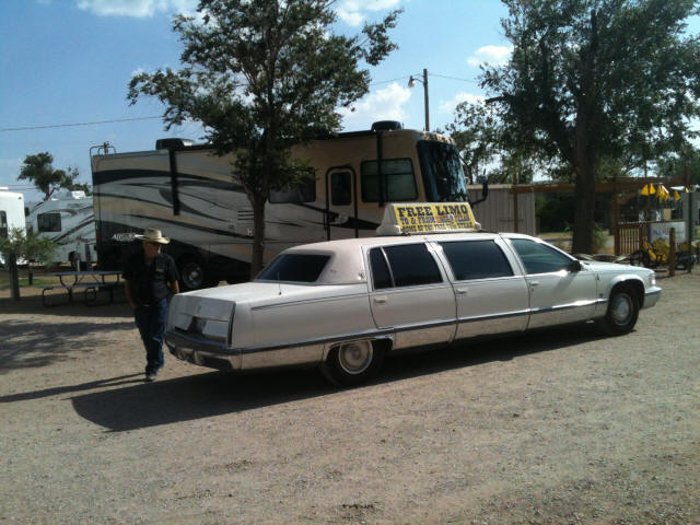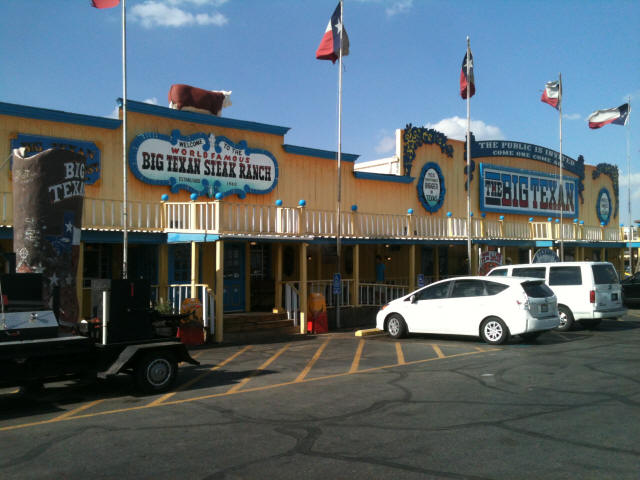 Vacation 2012, Day 43 July 28 1. Limo picking us up. 2. The Big Texan Steak Ranch 3. Customer about to run out of time. Click pictures to enlarge. Ate breakfast in the RV and then headed south on US 54 to Stratford TX where we tuned onto US 287 south to Amarillo TX. Got a campsite at Amarillo KOA. Went shopping at Wal-Mart. Got the oil changed in the RV. Went back to the campground and did some laundry. Got picked up in a Limo to take us to The Big Texan Steak Ranch for supper. They offer a FREE 72 ounce steak dinner if you can eat it less than 60 minutes. If you don't finish in 60 minutes it costs $72.00. We saw two people fail to finish in time. After supper the limo returned us to camp. Domino Scores Jim: 85 Marilyn: 93 Weather: Sunny, Scattered clouds, Hot, Humid. Lowest Gas Price: $3.199 Mileage Today: 149 Mileage For Trip: 7575 Copyright 2012