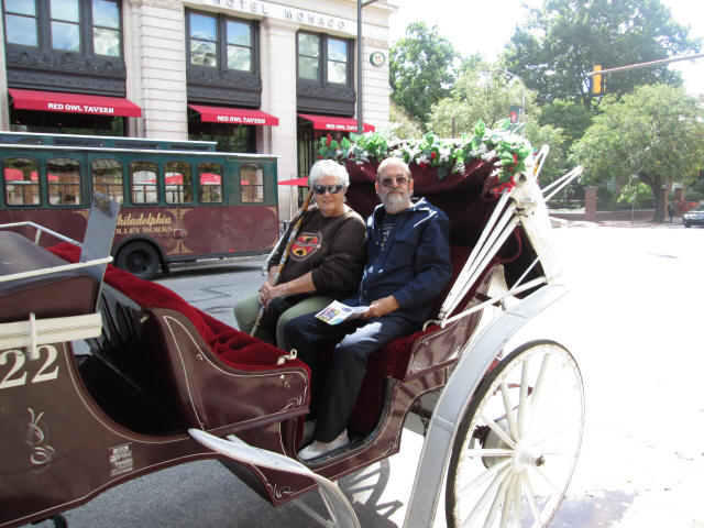 Vacation 2014, Day 24 September 14 Our Carriage - Constitution Hall - The Liberty Bell Click picture to enlarge, use back button to return Breakfast in the RV. Drove to Historic Philadelphia where we started off with a one hour carriage ride around the historic area. Our guide Elaine and our horse was Dock. We s aw many, many historic buildings learned a lot about the history of Philadelphia. After the tour we went to the Liberty Bell Pavilion and saw the liberty Bell. Then it was time to drive back to camp. Stopped on the way back to eat an early supper at The Texas Roadhouse and did some shopping. Domino Scores Jim: 51 Marilyn: 46 Weather: Sunny and low 70's Lowest Gas Price: $3.339 Mileage Today: 0 Mileage For Trip: 3379 Copyright 2014